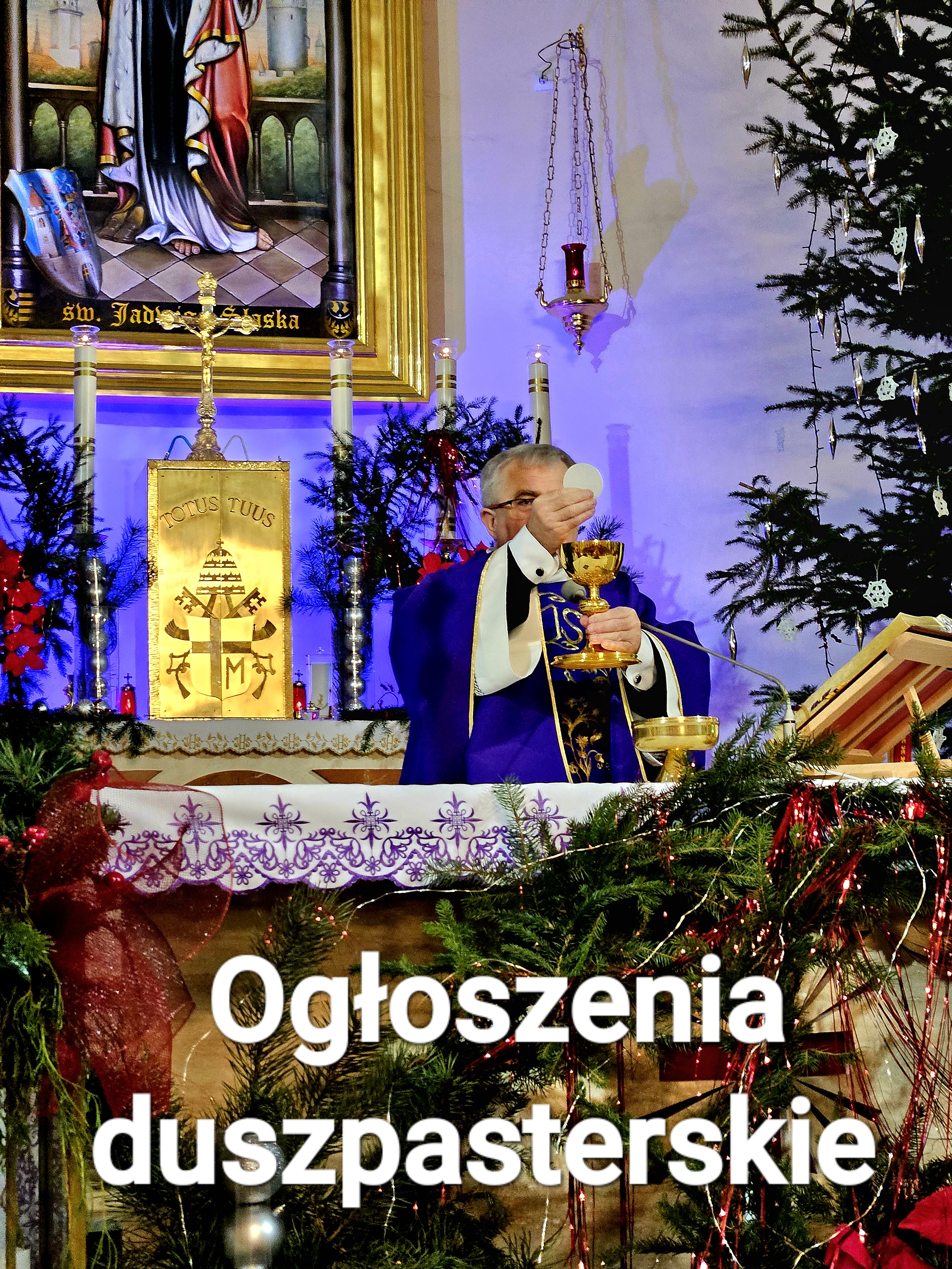 parafia7 21 grudnia 2025 CZWARTA NIEDZIELA ADWENTU- ogłoszenia duszpasterskie od 22 do 28 grudnia 2025 roku. W PONIEDZIAŁEK 22.12.2025 SPOWIEDŹ ŚWIĘTA OD GODZ. 08.00-09.00 ZAKOŃCZONA MSZĄ ŚW. OD GODZ. 16.30-17.30. i MSZA ŚW. RORATNIA We wtorek msza św. nie będzie sprawowana. W ŚRODĘ Wigilia Narodzenia Pańskiego- Pasterka o godz. 22.00. Proszę, aby Bractwo Świętego Józefa na tę Uroczystość przyszło w togach. W CZWARTEK Uroczystość Narodzenia Pańskiego, msze św. sprawowane będą o godz. 10.00 i 12.00. W PIĄTEK Święto Św. Szczepana. Porządek mszy św. jak w każdą niedzielę. W tym dniu cała zebrana taca przeznaczona będzie na Wyższe Seminarium Duchowne w Legnicy. W SOBOTĘ Święto Św. Jana Apostoła i Ewangelisty Msza św. o godz. 09.00. Na tej mszy nastąpi poświęcenie wina. W przyszłą niedzielę Święto Św. Rodziny Jezusa, Maryi i Józefa Po sumie zmiana Tajemnic Żywego Różańca. W tym dniu od godz. 14.30 odwiedzę z wizytą duszpasterską Rodziny zamieszkałe przy ulicy Władysława Jagiełły od nr 1. INTENCJE MSZY ŚW. W TYGODNIU: poniedziałek: – godz. 09.00 za zm. z Rodziny RYDEL Anielę i Bolesława oraz Synów Leszka, Krzysztofa i Zdzisława – godz.18.00 za zm. Czesława BIBER. wtorek: – msza św. nie będzie sprawowana środa – Pasterka godz. 22.00: – za Parafian –za zm. Bolesława JANECZEK – za zm. Rodziców Anastazję i Władysława KŁOS i za zm. Ich Rodziców – za zm. Rodziców Marię i Adolfa oraz Ich Dzieci Helenę i Jana . czwartek : – godz. 10.00 za zm. Józefa TUMIR – godz. 12.00. za zm. Rodziców Annę i Piotra SANDECKICH oraz Rodzeństwo Marię i Antoniego. piątek: – godz. 08.00 w rocznicę śmierci Rodziców Helenę i Bronisława DRACZ – godz. 10.00 za zm. Agnieszkę i Józefa MAJOCHA oraz Ich Rodziców. – godz. 12.00 za zm. Żonę Grażynę MAZUR w 7 rocznicę śmierci sobota: – o godz. 09.00 w intencji Wiktora w 14 Rocznicę Urodzin INTENCJE MSZY ŚW. W NIEDZIELĘ: godz. 08.00 –za zm. Mamę Janinę GRZESIAK w 1 rocznicę śmierci godz. 10.00 –za zm. Henrykę , Leszka i Grzegorza ZAJĄC i Ich Rodziców godz. 12.00 –godz. 12.00 w intencji Matek i Ojców z Żywego Różańca Zachęcam do pobrania katolickiej aplikacji “DROGOWSKAZ” Szczegóły informacyjne o aplikacji na tablicy ogłoszeń. Bardzo Dziękuję wszystkim Darczyńcom za złożoną ofiarę na zapłacenie raty za malowanie kościoła. Bardzo Dziękuję również Paniom i Panom za pomoc przy sprzątaniu, ustawianiu świątecznych dekoracji w naszym kościele. SERDECZNE BÓG ZAPŁAĆ. Do nabycia są czasopisma katolickie: – NIEDZIELA 12 zł -w przyszłym tygodniu wydanie świąteczne GOŚĆ NIEDZIELNY i NIEDZIELA z kalendarzem na 2026 rok -koszt 15zł Wychodząc z kościoła nasi Ministranci rozprowadzają jeszcze “sianko” na stół wigilijny. Złożona ofiara będzie przeznaczona na cele Służby Liturgicznej Ołtarza .