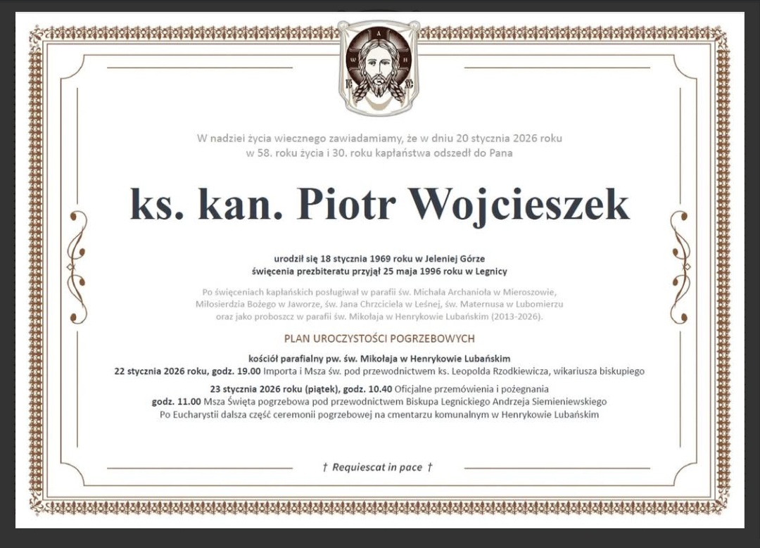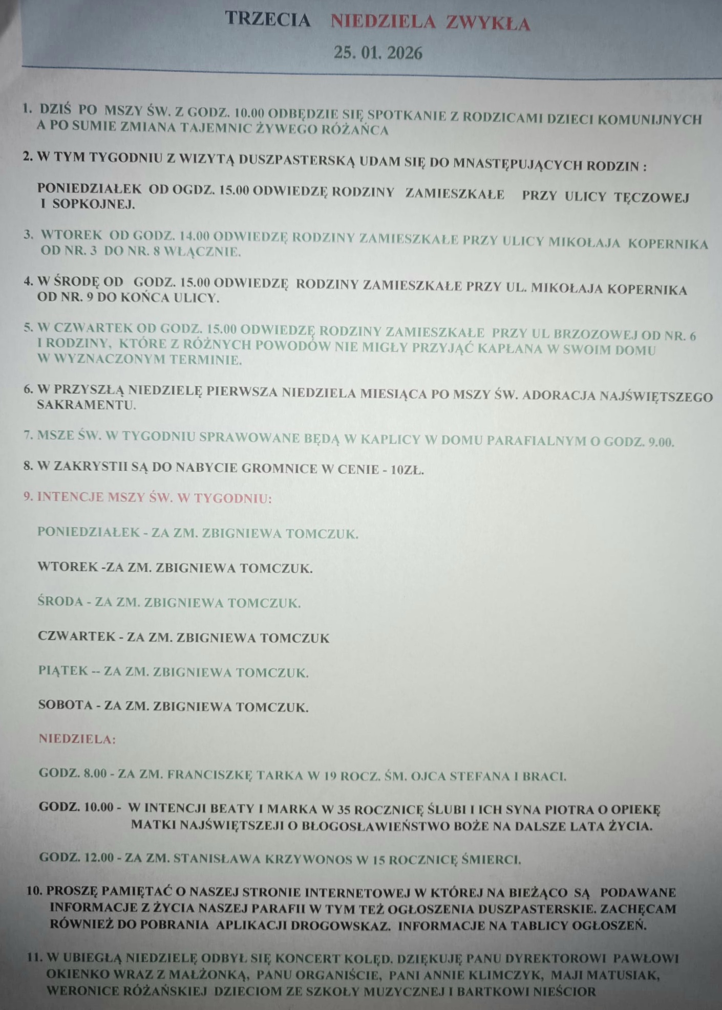 parafia7 18 stycznia 2026 DRUGA NIEDZIELA ZWYKŁA- ogłoszenia duszpasterskie od 19 do 25 stycznia 2026 roku. Dziś po mszy św. z godziny 12.00 odbędzie się spotkanie z Pielgrzymami udającymi się do Fatimy. Po południu na godzinę 16.00 ZAPRASZAM na KONCERT KOLĘD w wykonaniu Uczniów i Absolwentów Szkoły Muzycznej Pierwszego Stopnia im. Oskara Kolberga w Lubaniu W TYM TYGODNIU Z WIZYTĄ DUSZPASTERSKĄ ODWIEDZĘ RODZINY ZAMIESZKAŁE PRZY ULICACH: – w poniedziałek od godz. 15.00 – ul. Oficerska od nr 1 do końca ulicy i ul. Agatowa od nr 2 do nr 24 i nr 3 – we wtorek od godz. 15.00 ul. Zgorzelecka od nr 31 do końca ulicy i ul. Garncarska – w środę od godz. 15.00 – ul. Cmentarna od nr 2 do końca ulicy i ul. Sąsiedzka od nr 19 do nr 1 – we czwartek od godz. 15.00 – ul. Wspólna od nr 17 do końca ulicy i ul. Cicha. – w piątek od godz. 15.00 – ul. Łagodna od nr 11, Jasna i Jana Pawła II – w sobotę od godz. 10.00 – ul. Perłowa i Szafirowa. W przyszłą niedzielę po Sumie zmiana Tajemnic Żywego Różańca. Msze w tygodniu sprawowane będą w Kaplicy Domu Parafialnego o godzinie 09.00. W Zakrystii do nabycia są świece GROMNICE w cenie 10zł W przyszłą niedzielę po mszy św. z godz. 10.00 odbędzie się spotkanie z Rodzicami Dzieci Komunijnych. INTENCJE MSZY ŚW. W TYGODNIU: poniedziałek: – za zm. Zbigniewa TOMCZUK (Gregorianka) wtorek: – za zm. Zbigniewa TOMCZUK (Gregorianka) środa: – za zm. Zbigniewa TOMCZUK( Gregorianka) czwartek : – za zm. Zbigniewa TOMCZUK (Gregorianka) piątek: – za zm. Zbigniewa TOMCZUK (Gregorianka) sobota: – za zm. Zbigniewa TOMCZUK (Gregorianka) INTENCJE MSZY ŚW. W NIEDZIELĘ: godz. 08.00 – za zm. Zbigniewa TOMCZUK (Gregorianka) godz. 10.00 – za. zm. Dorotę HUBISZ w 7 rocznicę śmierci godz. 12.00 – w intencji Matek i Ojców Żywego Różańca oraz za zm. Genowefę MOCKAŁŁO Zachęcam do pobrania aplikacji DROKOWSKAZ Wszystkim Darczyńcom serdecznie dziękuję za złożona ofiarę na budowę naszego kościoła – malowanie świątyni. Serdeczne Bóg Zapłać.